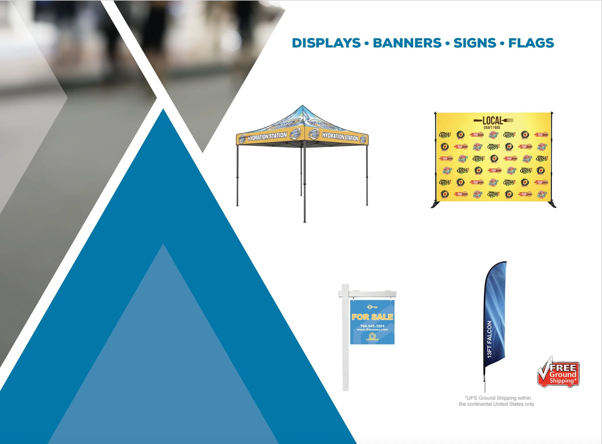 Looking to stand out at your next event? We offer custom Canopy Tents, Fabric Backdrop Displays, Tradeshow Booths, Feather Flags, Table Cloths, and much more!