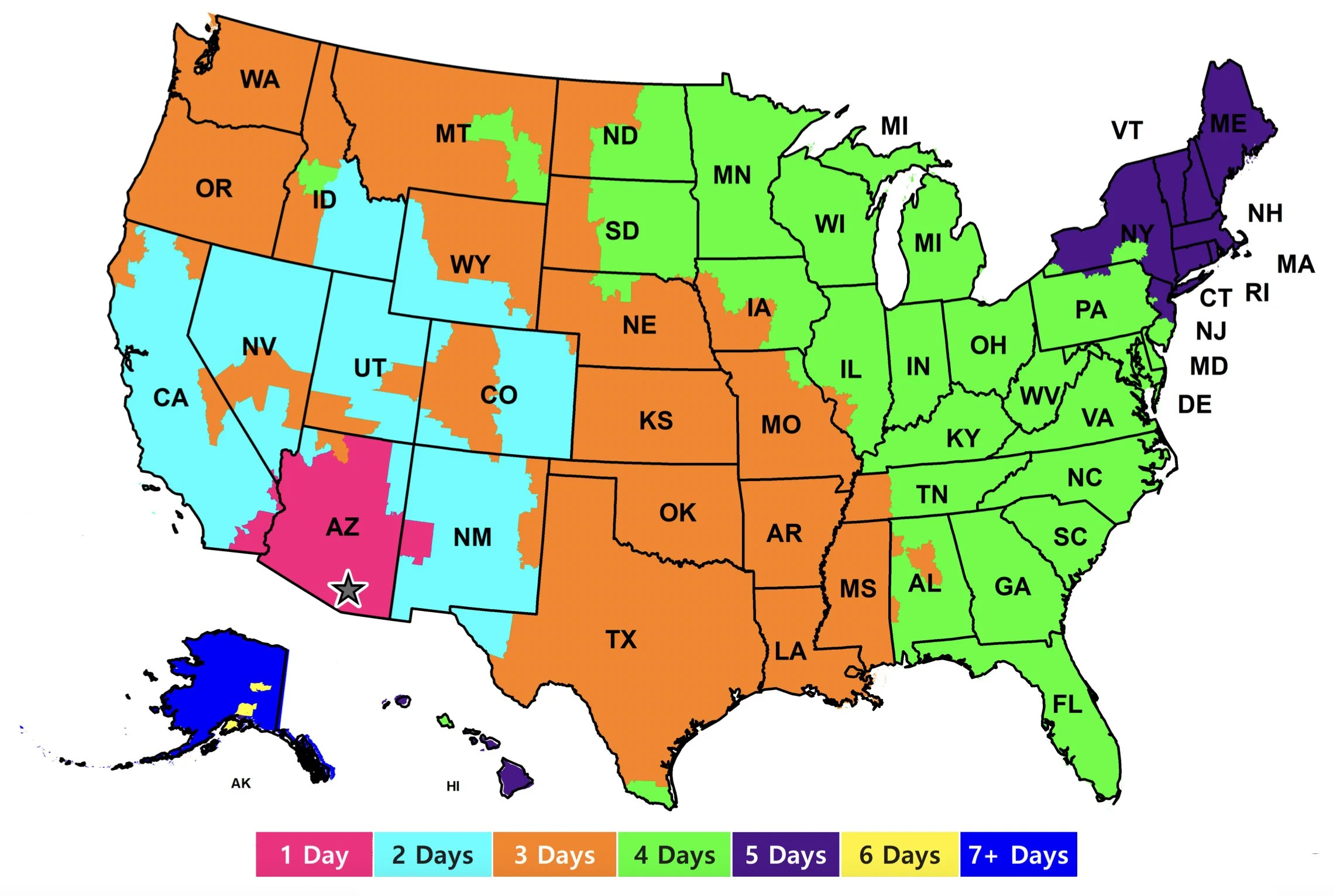 Shipping time will vary depending on where you are located in the U.S. 288 Prints ships via FedEx. Please refer to the map below to determine your approximate shipping time.